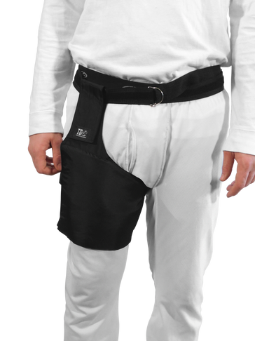 Take a single Thigh Guardz and extend the upper sleeve, sliding it under the belt. Now position the outer edge so that it is parallel to the outside thigh.